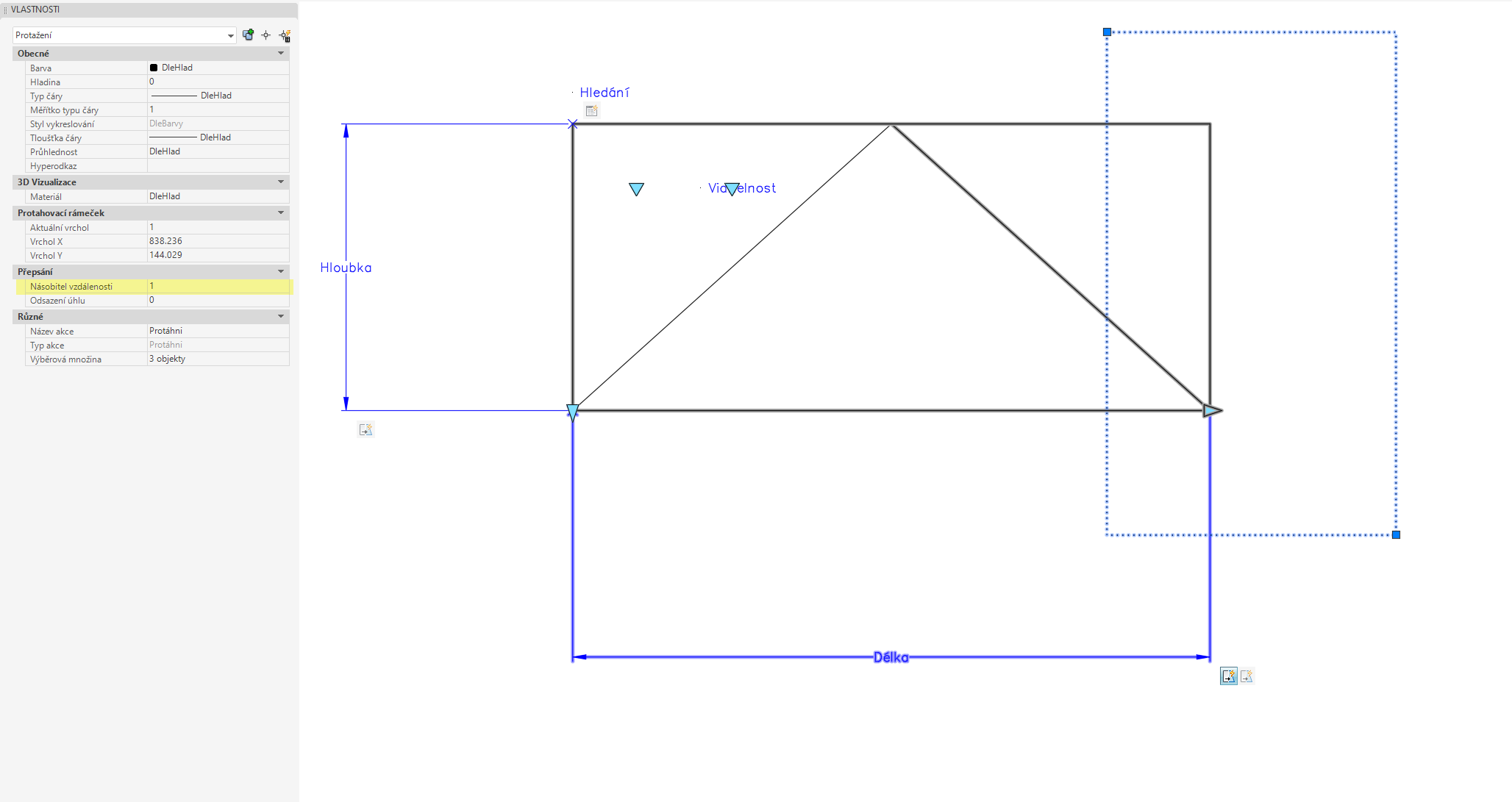 Upozornění: V definici rámečku protažení u první akce mějte zahrnutu pouze tu pravou část a nezahrnujte středovou část (spojnici diagonál), kterou si přejete protahovat o polovinu.
