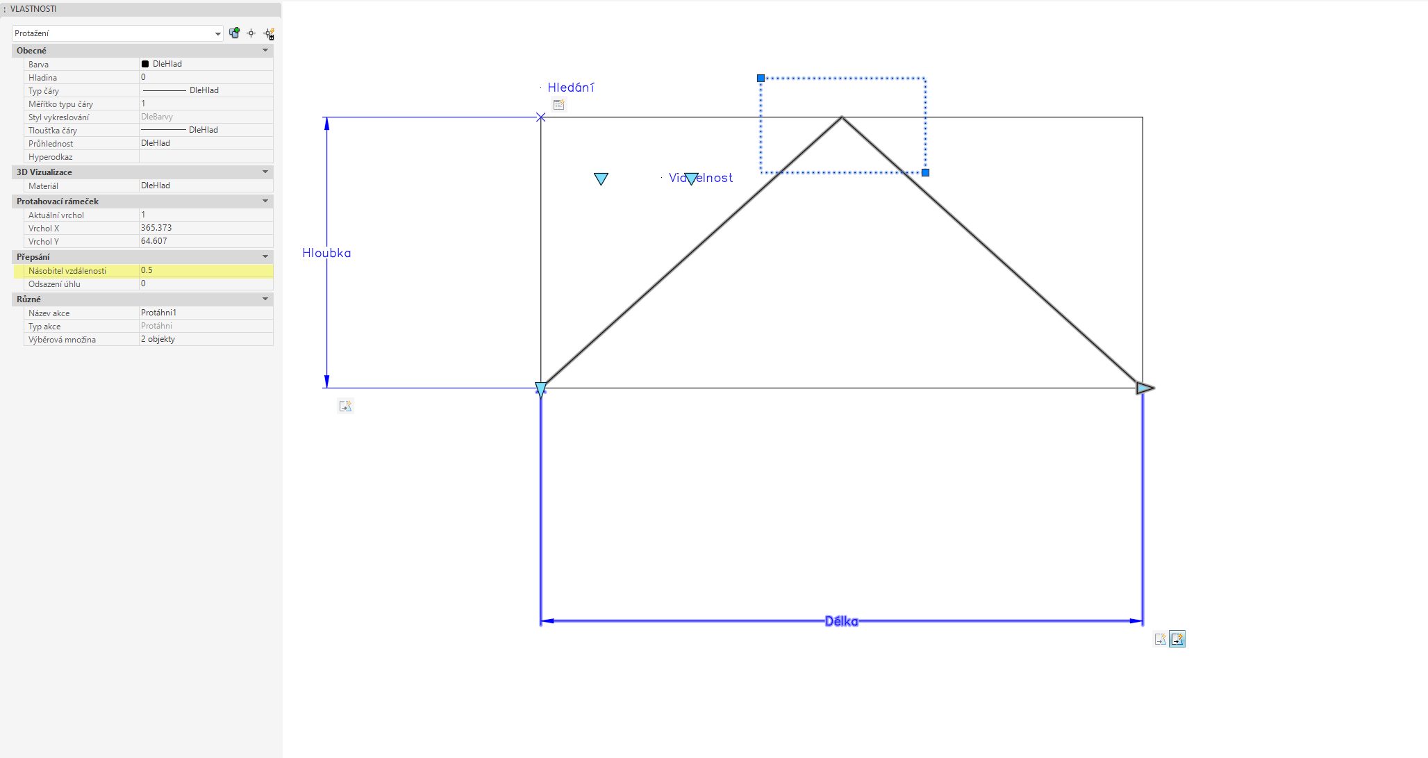 - Druhá akce … protahuje pouze středovou část a vlastnost Násobitel vzdálenosti = 0.5